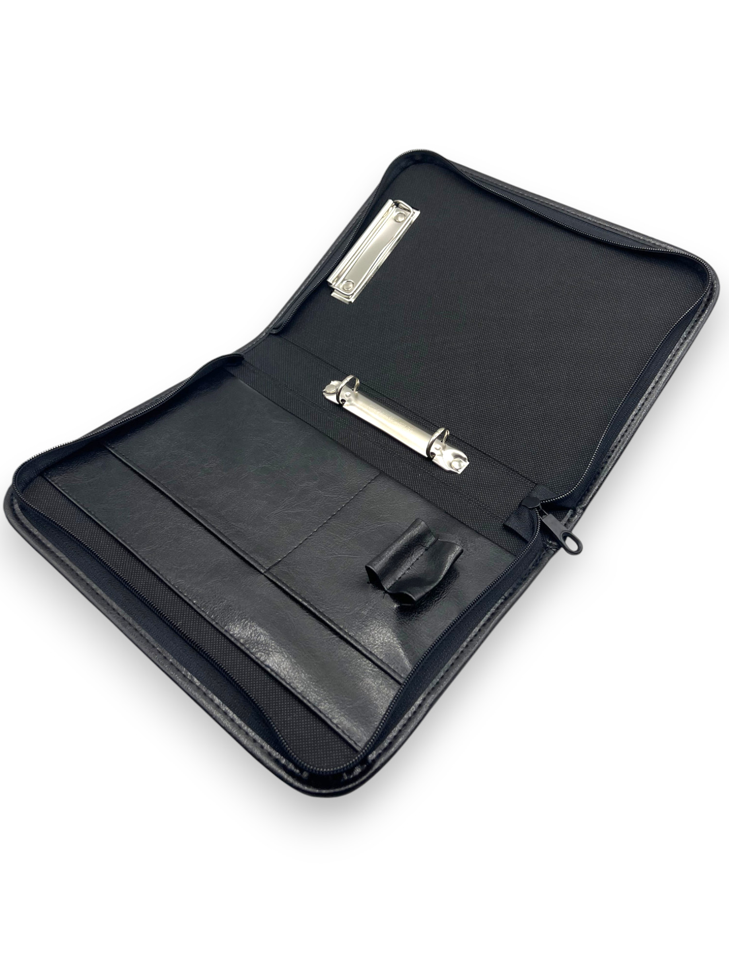 The folder is secured with a durable zipper closure, and the outer surface is made of sturdy, leather-like fabric resistant to dirt and wear.