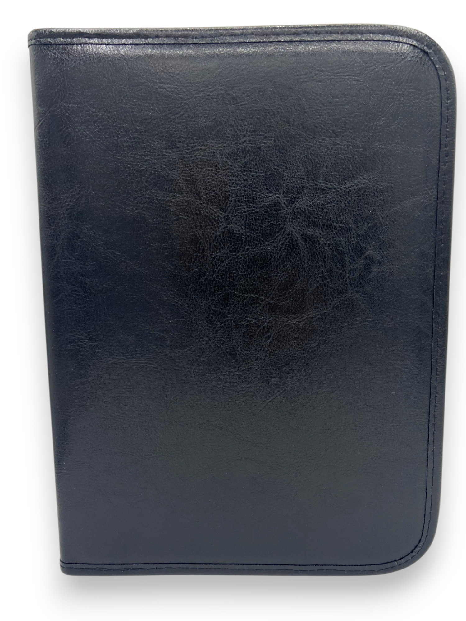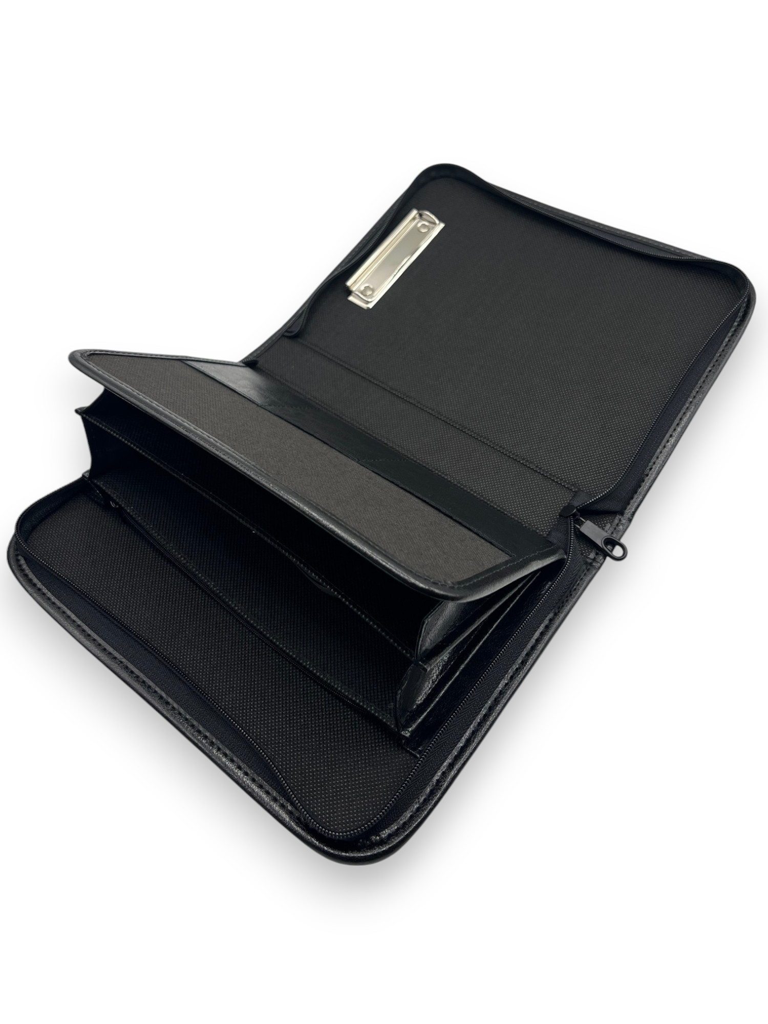The folder is secured with a durable zipper, and the outer surface is made of sturdy leather-like fabric, resistant to dirt and wear.